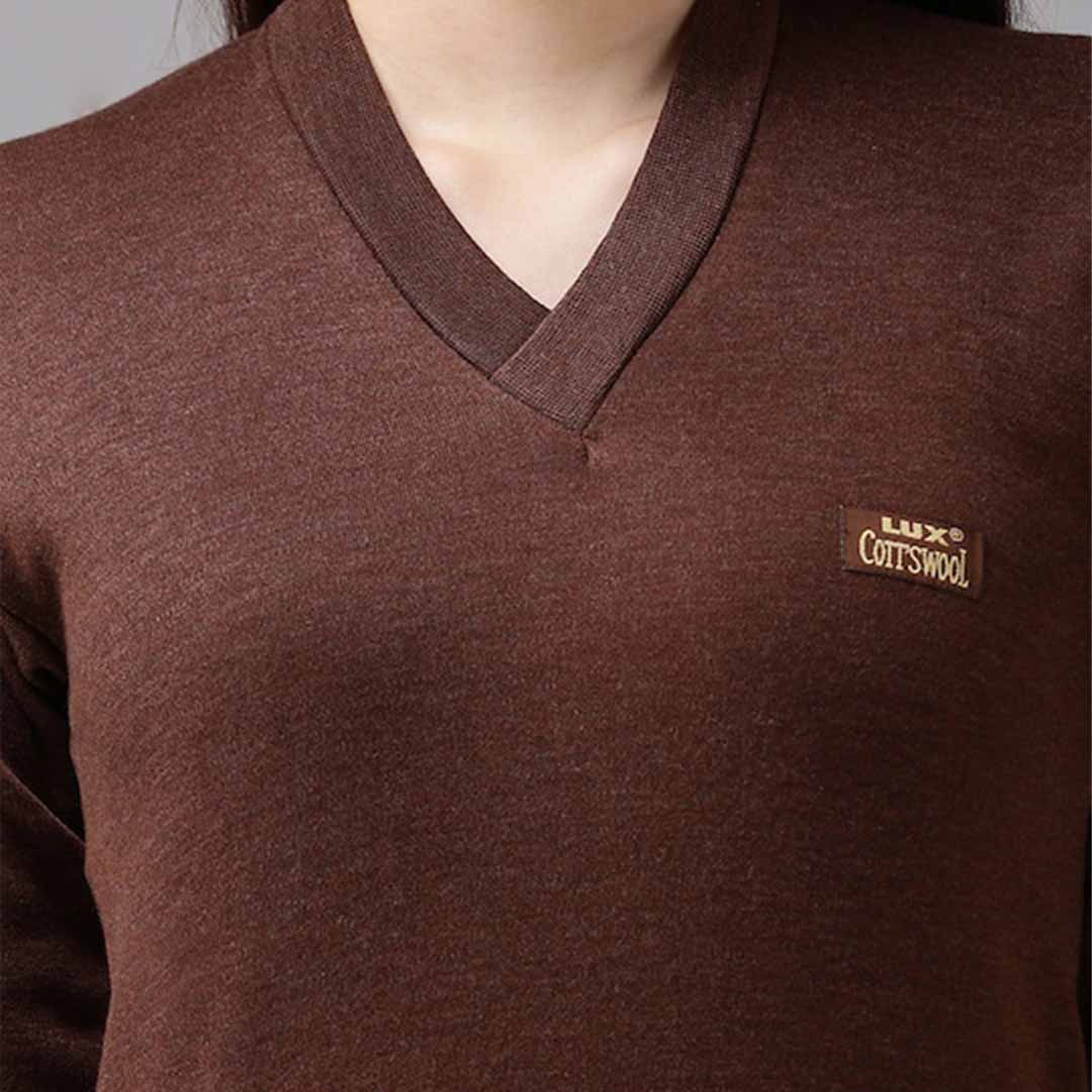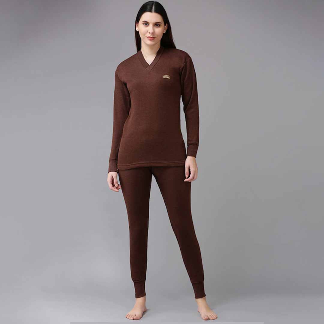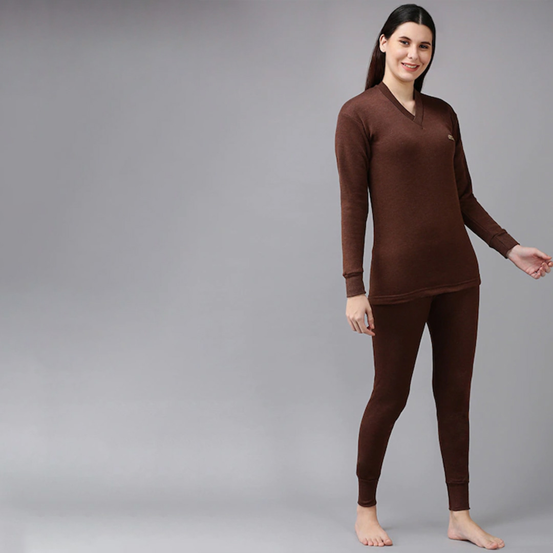 Pack of 2 thermal set Brown solid thermal top , has a V-neck and long sleeves Brown solid regular-fit mid-rise thermal bottoms , has an elasticated waistband with slip-on closure, cuffed hems